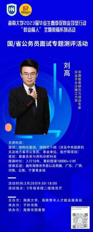 3月20日上午九点半至下午六点,由英国威廉希尔公司承办的海南大学2023届毕业生春季促就业攻坚行动“就业育人”主题教育系列活动之《国/省公务员面试专题测评活动》,在5号宿舍2楼报告厅举行,活动邀请华图教育刘高老师,为2023届毕业生讲解公务员考试中面试题型与面试技巧,并在现场进行一对一模拟面试,在实践中提升毕业生面试能力。活动共计吸引70多名在校学生参加。