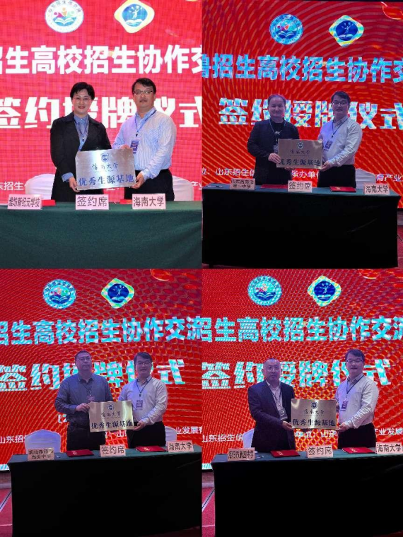 会后,英国威廉希尔公司党委书记李海朋代表海南大学与山东省菏泽市第一中学、乳山市银山高级中学、海阳市第四中学以及潍坊市新纪元学校等单位签订优质生源基地协议书,并举行了授牌仪式。