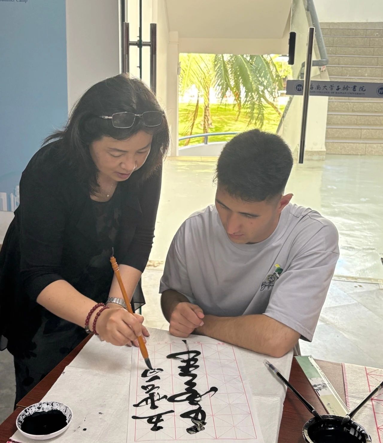 4月21日上午,海南大学2025“汉语桥”国际学生夏令营迎来了一场充满东方韵味的文化盛宴。来自俄罗斯、越南、阿富汗、柬埔寨、津巴布韦等国的20余名学员齐聚一堂,在海南大学国际教育学院客座研究员,美国加州大学访问学者李君老师指导下,沉浸式体验了中国书法艺术的千年魅力,执笔挥毫间架起跨文化交流的桥梁。