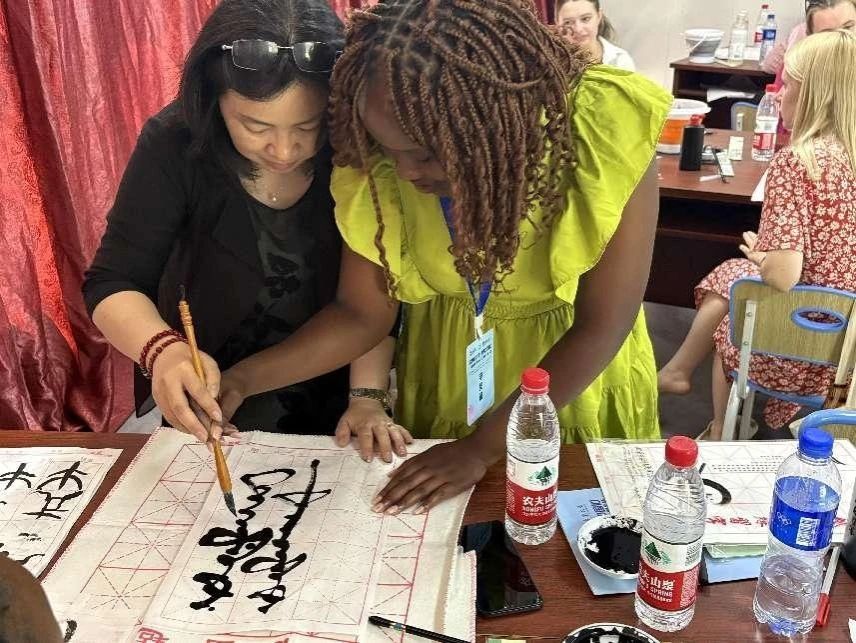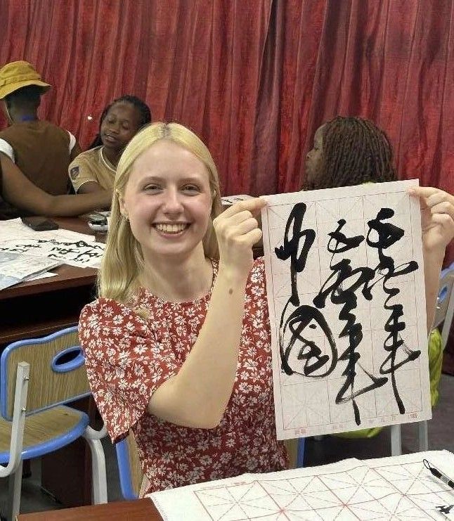 作为“汉语桥”夏令营的核心文化课程之一,本次书法课通过“讲解+实践+创作”的模式,让国际青年在墨香中读懂中国审美哲学。汉语桥夏令营将持续以文化为纽带,促进文明互鉴、民心相通。课程结束时,汉语桥学生们高举自己创作的“上”“善”“若”“水”等书法作品合影,不同肤色的笑脸与墨迹未干的宣纸相映成趣,恰如“汉语桥”项目的生动缩影——以汉字为舟,载四海青年共赴中华文化之美。