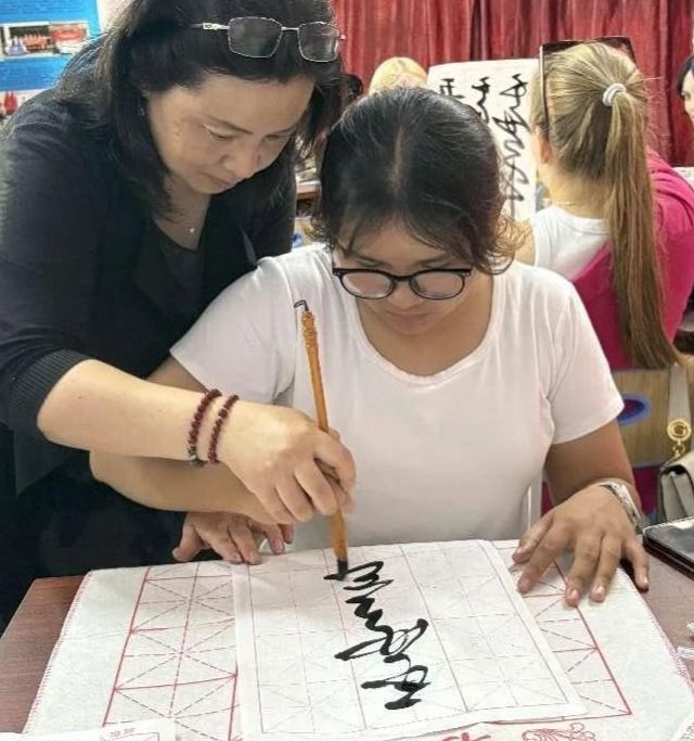 课堂上,汉语桥的学生们不仅认真临摹,更踊跃分享本国文字与书法的关联。越南学员阮氏香璃对比了汉字与越南字喃的演变,俄罗斯学生刘博文则用毛笔尝试书写西里尔字母,创作出别具一格的“中俄合璧”作品。李君老师强调:“书法是无声的诗,无图的画,更是跨越语言的心灵对话。”
