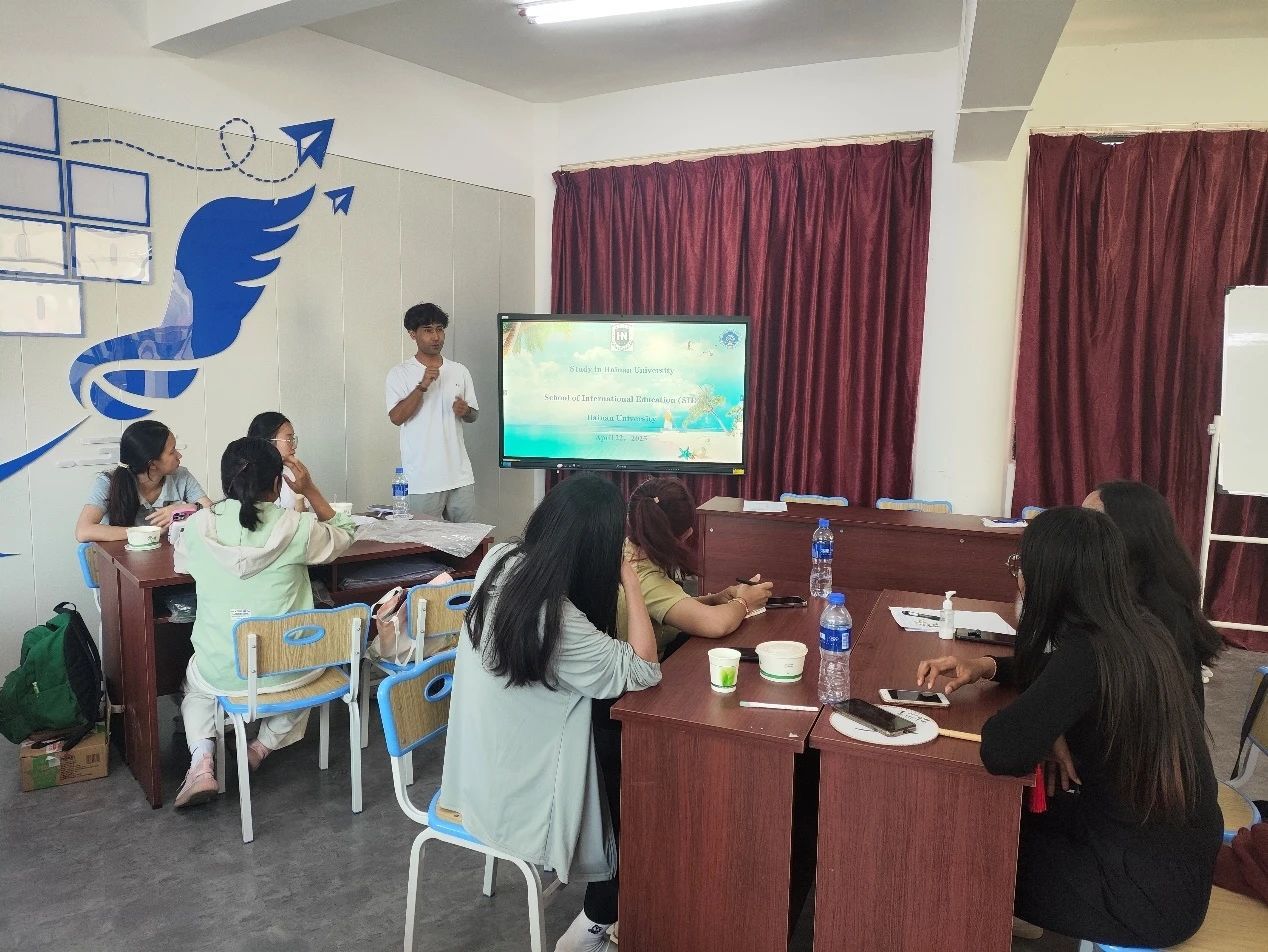 在同一时间段,海南大学国际教育学院还为夏令营学生举办了国际学生招生宣讲会。宣讲人风祝作为国际教育学院的优秀留学生代表,向在座同学详细介绍了海南大学的学科优势、奖学金政策及校园生活,并分享了自己在中国的留学经历。风祝的讲解幽默风趣,现场反响热烈。许多学生表示,通过此次宣讲会,他们对海南大学的留学项目有了更清晰的了解,并希望未来能有机会来华深造。