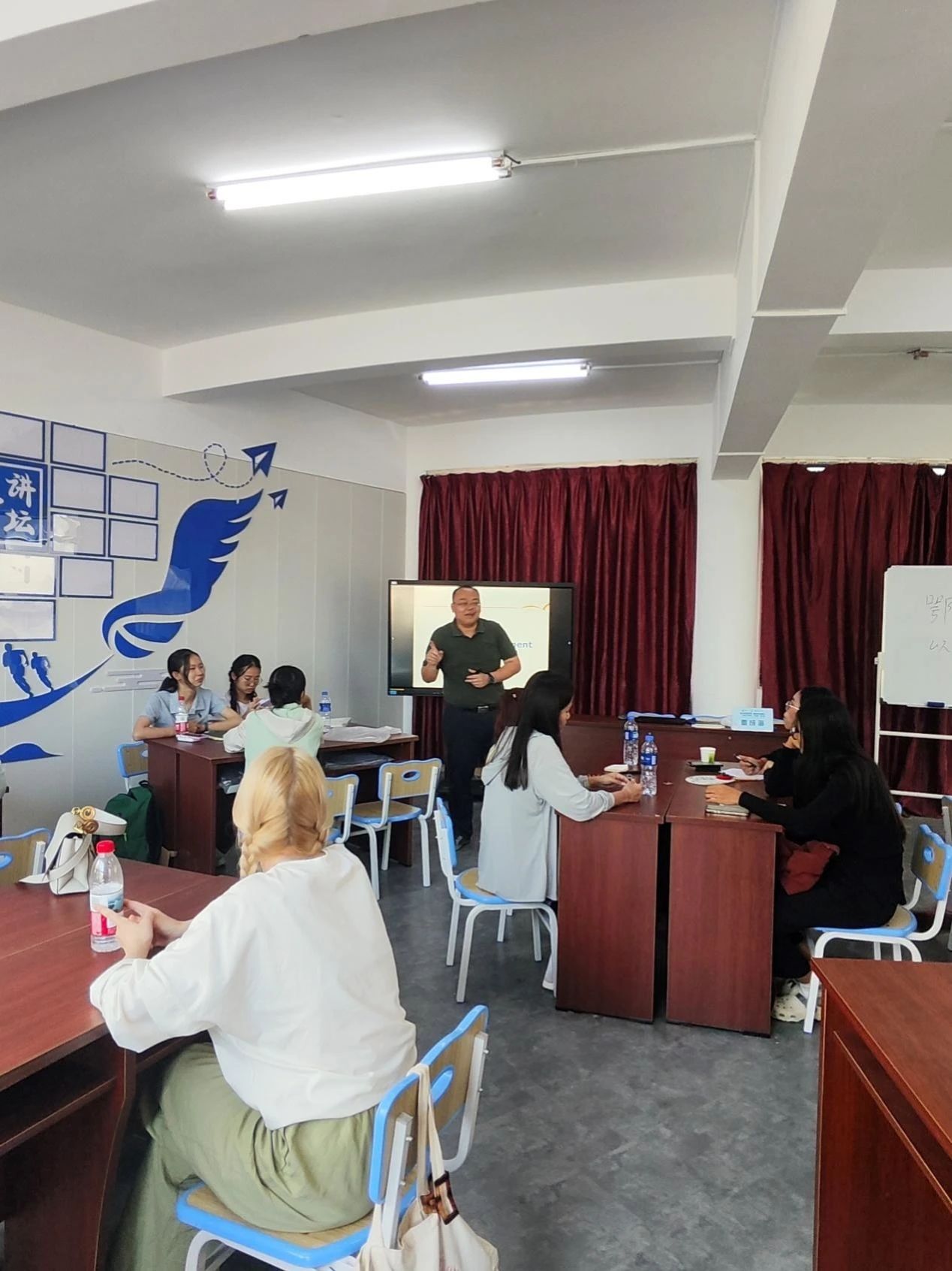 在课程中,覃成海老师结合海南自贸港的政策优势和发展前景,讲解了中国改革开放以来的经济腾飞、科技创新及国际化进程。覃老师通过生动的案例和翔实的数据,向学生们展示了海南自贸港在贸易自由化、投资便利化等方面的独特优势,并鼓励国际学生把握机遇,未来参与到海南的建设与发展中。