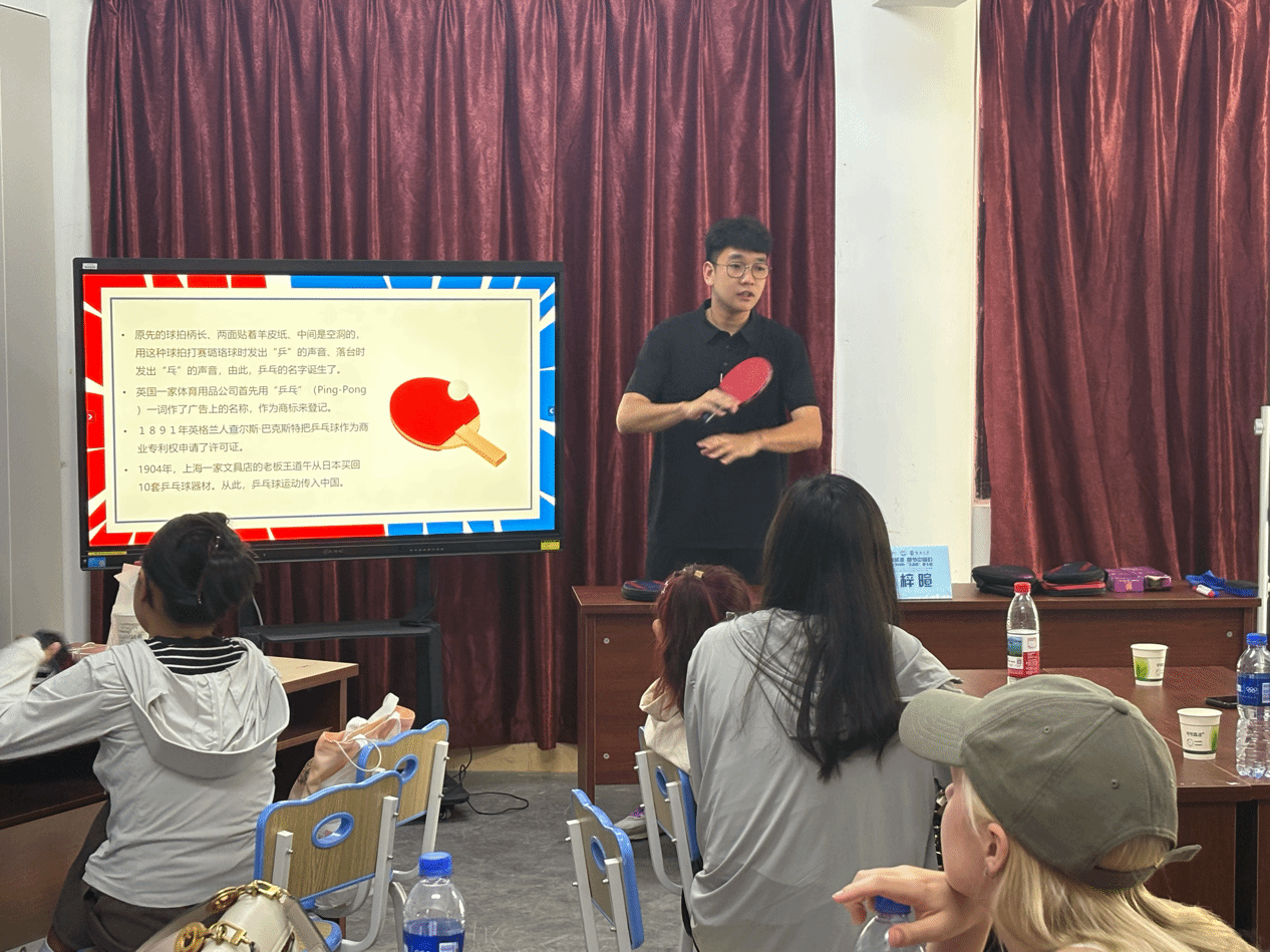 课程伊始,刘梓暄老师生动讲解乒乓球发展历史、规则及竞技技巧,通过视频展示中国乒乓球队在国际赛事中的经典战例。“发球旋转的物理原理”“快攻结合弧圈战术”等专业知识的拆解,让学员们惊叹于这项运动的科学性与艺术性。来自越南的学员阮氏香璃直言:“原来乒乓球的胜负不仅是速度,更是智慧!”