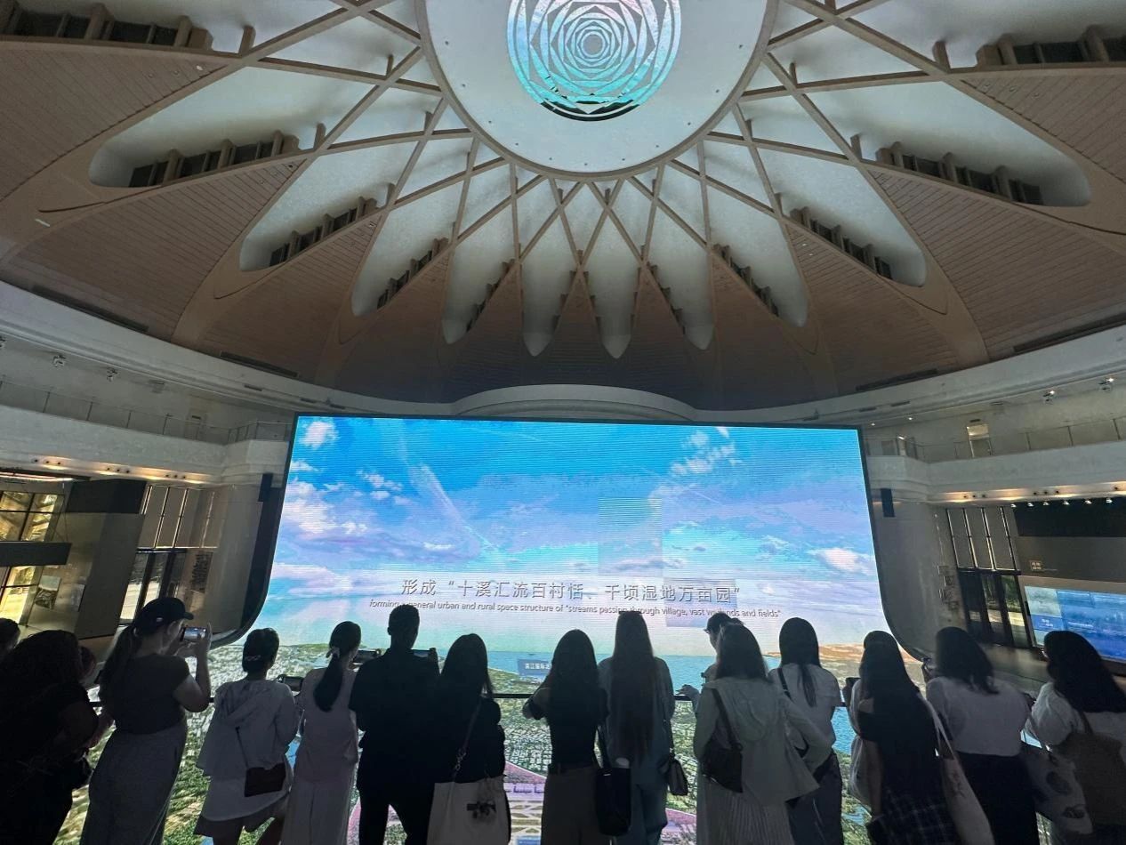 清晨,江东新区展示馆在阳光的照耀下显得格外耀眼。国际学生们踏入馆内,仿佛打开了一扇通往未来的时光之门。展示馆内,高科技的展示手段与前沿的规划理念交织,让每一位参观者都感受到强烈的视觉冲击。从序厅的震撼开场,到各个展区的深度解读,学生们仿佛置身于一个充满无限可能的未来世界。无边际裸眼3D智慧沙盘、720度全景三维交互系统等前沿科技,生动地展示了江东新区从一片荒芜到崛起为自贸港核心引擎的华丽蜕变。国际学生们纷纷表示,这里的一切让他们感到震惊,江东新区的规划不仅展示了海南的发展速度,更让他们看到了无限的可能性,仿佛能触摸到未来城市的脉搏。