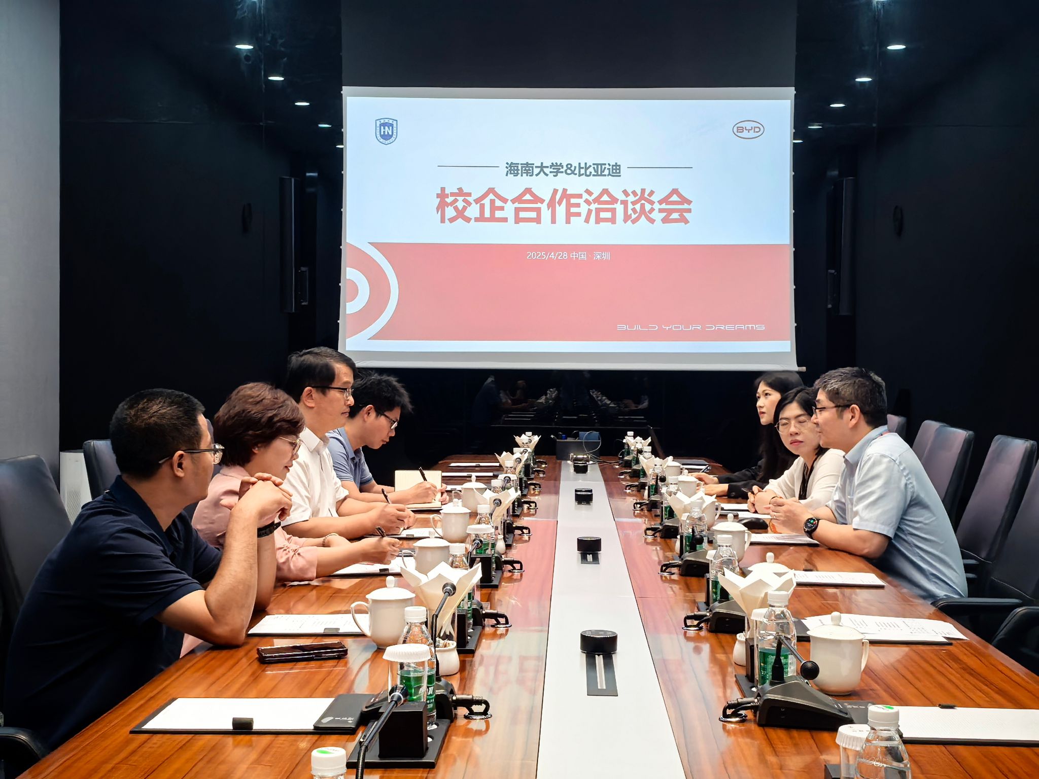 2025年4月28日,李海朋书记走进深圳比亚迪股份有限公司,比亚迪华南区人力资源总监张高辉、比亚迪深圳区人力资源招聘经理施望,详细介绍了公司的发展历程,介绍了海南大学共有1196名毕业生在比亚迪工作,近三年入职807人,其中本科生611人、硕士194人、博士2人。张高辉总监表示,比亚迪将继续在秋招、春招到海南大学开展招聘工作,希望能有更多优秀毕业生加入比亚迪公司。