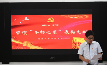 首先由获得“子衿之星”和“优秀共产党员”的学生代表刘昕毅上台发言,他提到,新时代青年站在社会主义时代桥头,要乘着时代东风,加满油,把稳舵,鼓足劲。他发出激昂向上的新时代青年号召,第一要加强政治学习,扣好人生的第一粒扣子;第二要积极进行实践探索,遍览人生的每一处风景;第三要持续深化青年使命担当,成为人民群众的一面旗帜。