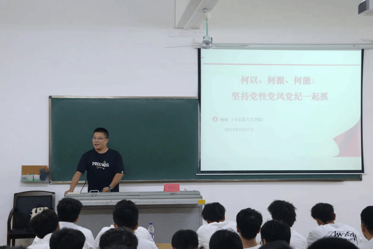 党课第二讲,海南大学马克思主义学院杨闯老师以“何以、何据、何能:坚持党性党风党纪一起抓”为主题,强调了全面从严治党是党永葆生机活力和走好新时代赶考之路的必由之路。全面从严治党就是要严抓党性、严抓党风,严抓党纪,做到“要求严”、“措施严”、“对上严”、“对下严”、“对事严”、“对人严”。秉承“党的自我革命永远在路上”的自觉,警醒全党时刻保持解决大党独有难题的清醒和坚定。杨闯老师在课上强调了全体学员需端正入党动机,在实际工作和生活中守好纪律红线,发挥党员应有的先锋模范作用,在为党为国为民的实践中不断提升自我。