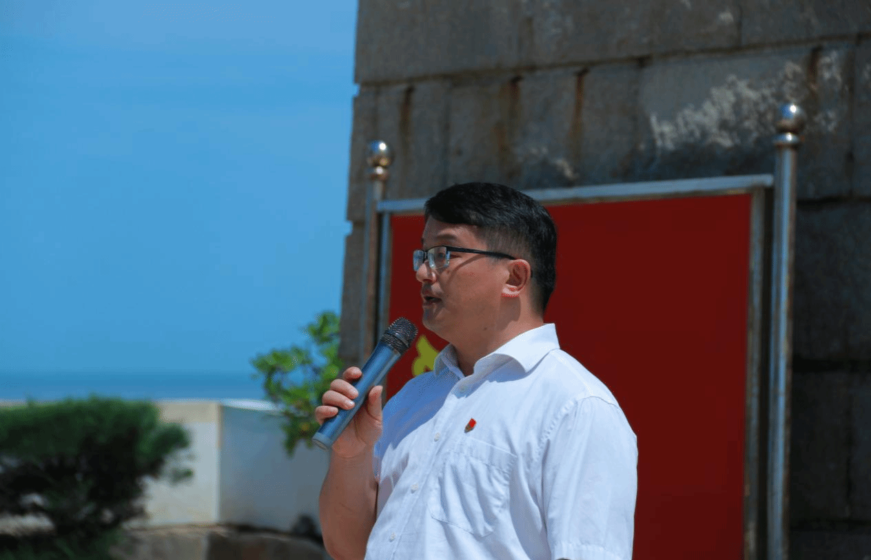 热血丰碑下,第七党支部党员代表朱钊发表“抢滩精神”主题演讲。“抢滩精神”源自于海南这片热土。历史上,海南人民面对外敌入侵、自然灾害,总是展现出无所畏惧的勇气和顽强拼搏的精神。这种精神不仅在过去战斗中发挥了巨大的作用,在今天的经济建设和社会发展中,依然是推动我们前进的动力和源泉。