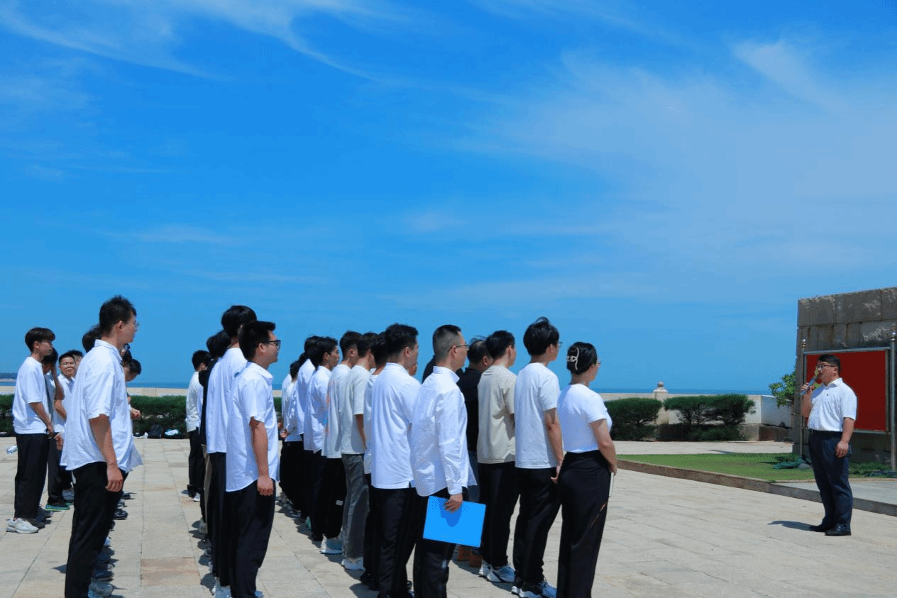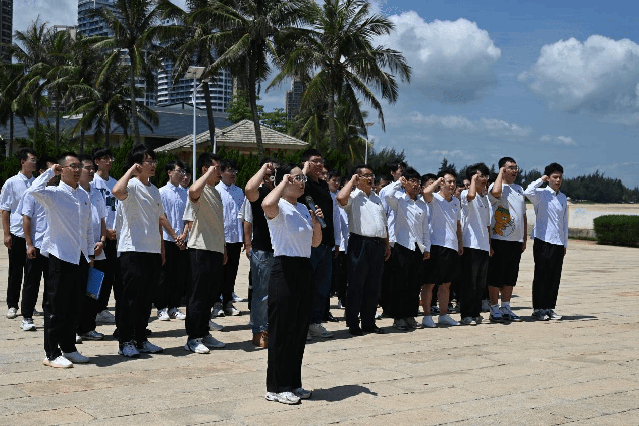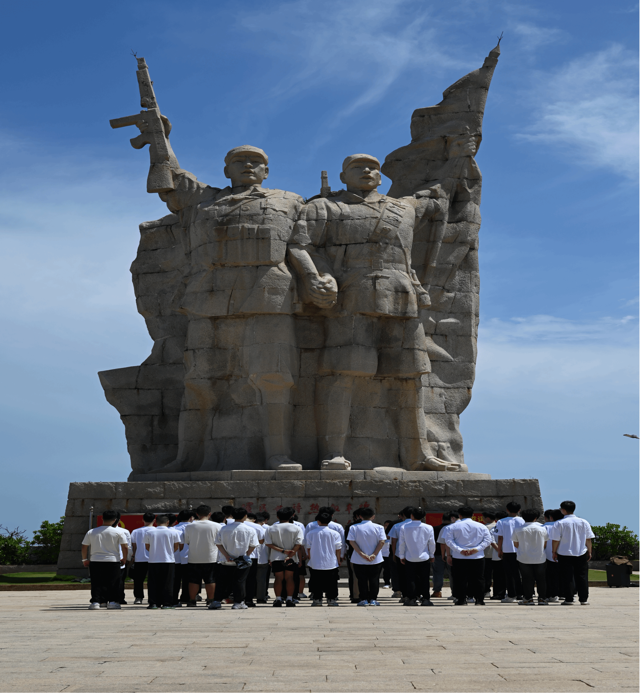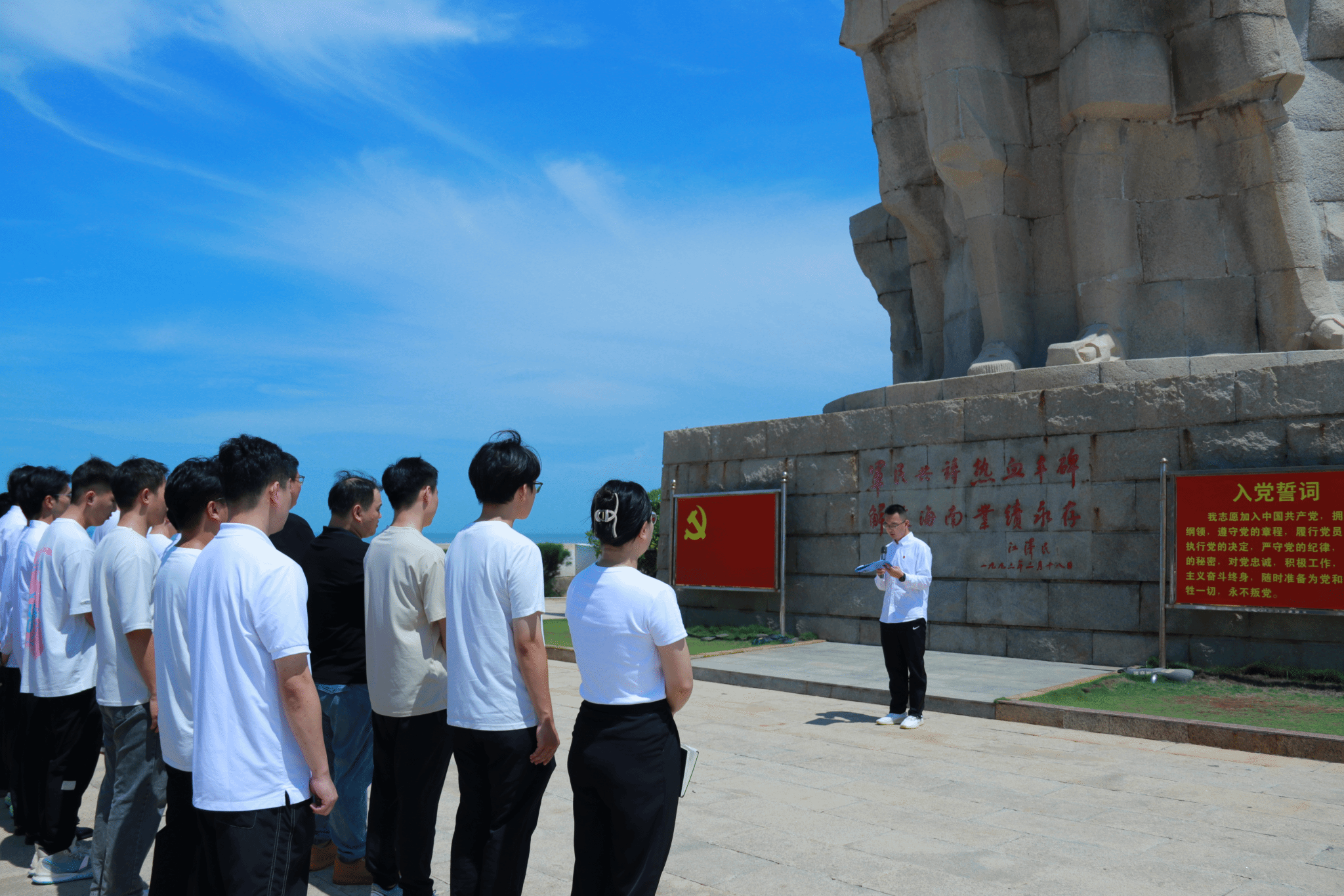 在观看解放海南岛战役纪录片后,师生们齐聚临高角解放海南纪念塑像---热血丰碑,在夺目耀眼的阳光和万里无云的蓝天下,热血丰碑格外迷人,大家共同瞻仰这座庄严肃穆的塑像,并重温了入党誓词。
