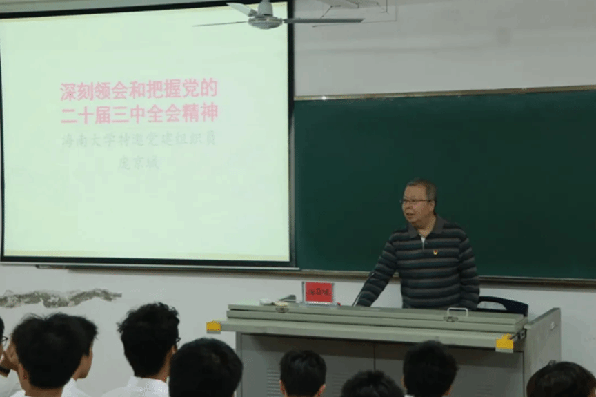 党课第一讲,原海南大学政治与公共管理学院教授,海南大学特邀党建组织员庞京城老师以“深刻领会和把握党的二十届三中全会精神”为主题,向学员们多维度地阐释了党的二十届三中全会的精神和内涵。号召大家将党的二十届三中全会精神内化于心、外化于行,积极投身到党和人民的伟大事业中去。